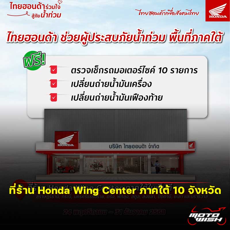 ไทยฮอนด้า ช่วยผู้ประสบภัยน้ำท่วมภาคใต้ ตรวจเช็กซ่อมรถจักรยานยนต์ ฟรี!! วันนี้-31 ธ.ค. นี้
