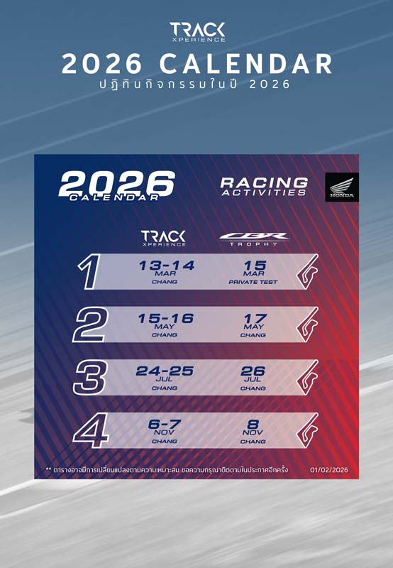 เปิดลงทะเบียนกิจกรรม Honda Track Xperience 2026 สนามที่ 2 : CBR TROPHY สนามที่ 1