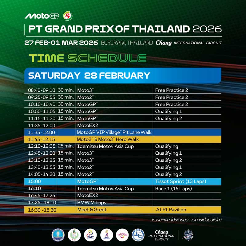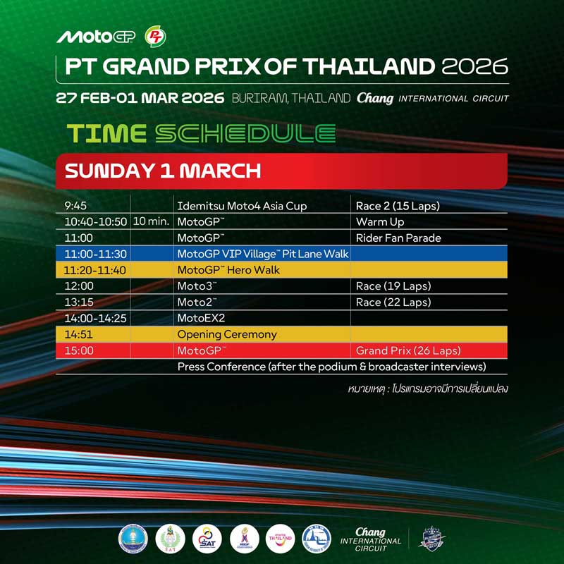 โปรแกรมการแข่งขันโมโตจีพี “PT Grand Prix of Thailand 2026”