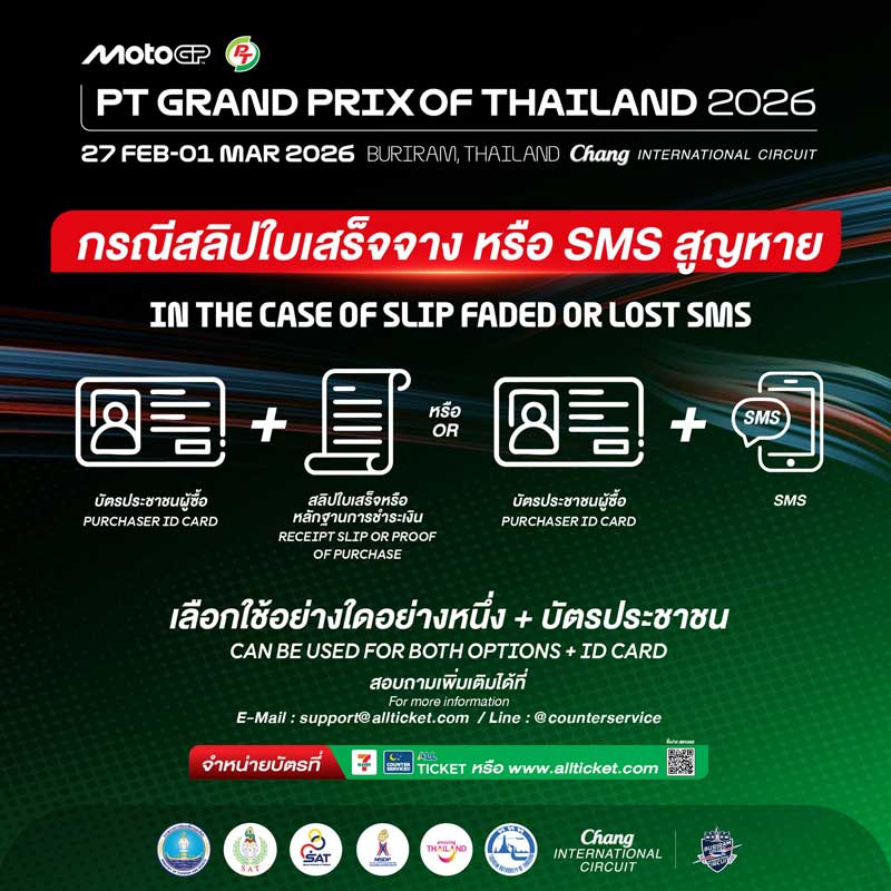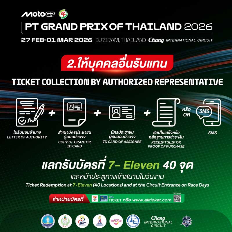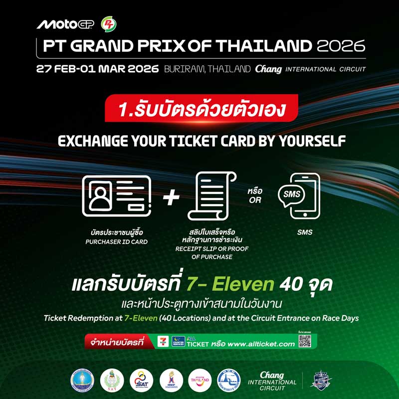 สำหรับแฟนมอเตอร์สปอร์ตที่ซื้อบัตรเข้าชม “PT Grand Prix of Thailand 2026” สามารถแลกรับบัตรพลาสติกได้ตั้งแต่วันที่ 16 ม.ค. – 15 ก.พ. 69 ณ จุดแลกบัตร Counter Service (All Ticket) ในร้าน 7-Eleven ทั่วประเทศ