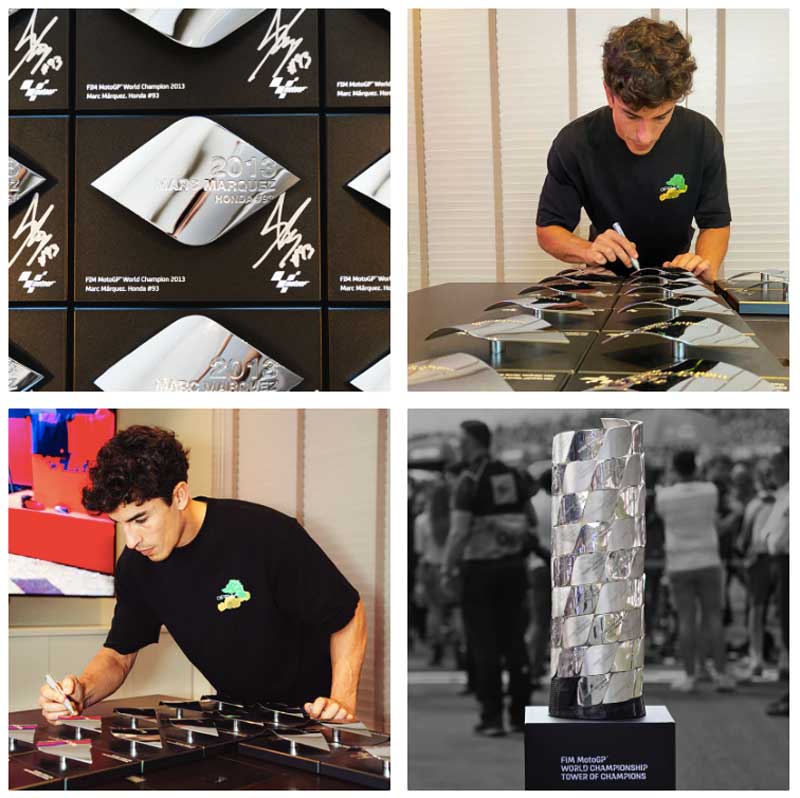 แผ่นโลหะจารึกถ้วยรางวัลชิงแชมป์โลก FIM MotoGP™ Marc Marquez 2013 พร้อมลายเซ็น ถ้วยรางวัล MotoGP™ คือผลงานศิลปะอันน่าทึ่งที่รังสรรค์โดยนักออกแบบชื่อดัง มาร์ก การ์เซีย โรฮาลส์ ถ้วยรางวัลดั้งเดิมมีเพียงหนึ่งเดียวในโลก โดยแชมเปี้ยนแต่ละคนจะมีแผ่นจารึกและชื่อของตนเองประทับอยู่บน “Champions Tower”