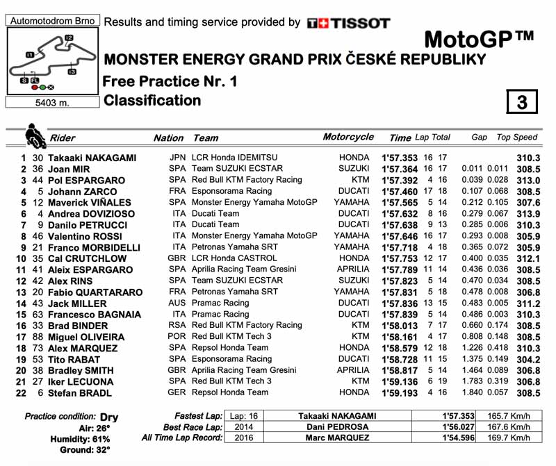กลับมาที่ผลการฝึกซ้อมครั้งที่ 1 ปรากฎว่านักแข่งที่ทำเวลาได้เร็วที่สุดคือ “ทาคาอากิ นาคากามิ” จากทีม LCR Honda IDEMITSU ด้วยเวลา 1.57.353 นาที ตามมาด้วย “โจอัน เมียร์” และ “โพล เอสปาร์กาโร่” อันดับที่ 2 และอันดับที่ 3 ตามลำดับ