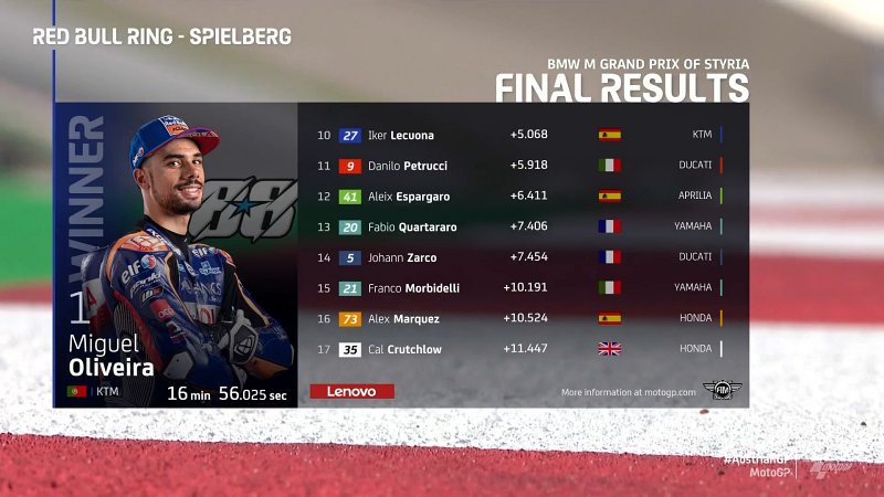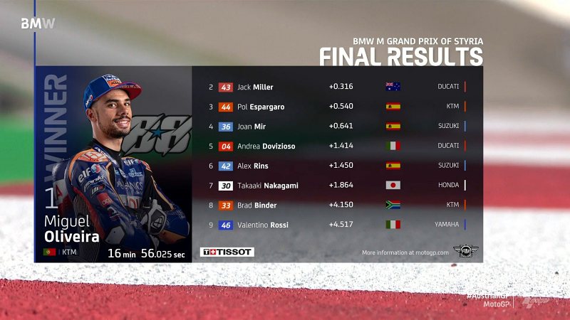 สรุปผลการแข่งขัน สนามที่ 5 รุ่นโมโตจีพี สนามเรดบูลริง แชมป์ตกเป็นของ “มิเกล โอลิเวร่า” จากทีม Red Bull KTM Tech 3 ตามมาด้วย “แจ็ค มิลเลอร์” ทีม Pramac Racing และ “โพล เอสปาร์กาโร่” จากทีมโรงงานเคทีเอ็ม สำหรับการแข่งขันครั้งต่อไป จะจัดขึ้นที่สนามมิซาโน่ ระหว่างวันที่ 11-13 กันยายน 2563