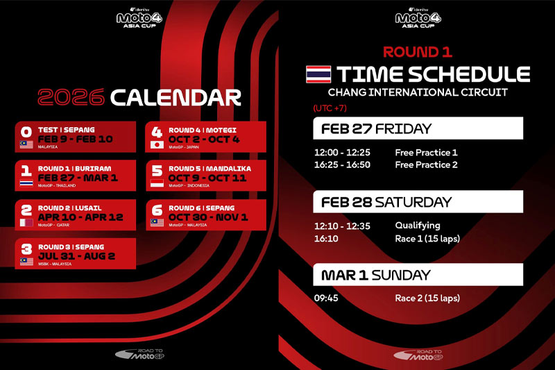 โดยการแข่งขัน Moto4 Asia Cup 2026 จะมีการจัดการแข่งขัน ที่สนามช้าง อินเตอร์เนชันแนล เซอร์กิต ประเทศไทย ในรูปแบบซัพพอร์ทเรซของการแข่งขัน ThaiGP 2026 ภายในระหว่างวันที่ 27 กุมภาพันธ์ – 1 มีนาคม นี้ และนอกจาก “วินนี่” – ธนัชชานนท์ ศรีเพชรสุวรรณ ยังมี “อุ้ม” นพรุธพงษ์ บุญประเวศ ตามด้วย “ธีรินทร์” เจคอบ เฟลมมิง และ “กัน” – พชรกร ทองเกิดหลวง ในฐานะนักบิดไทยที่ได้สิทธิ์ในการลงแข่งในเวทีนี้แบบเต็มฤดูกาล
