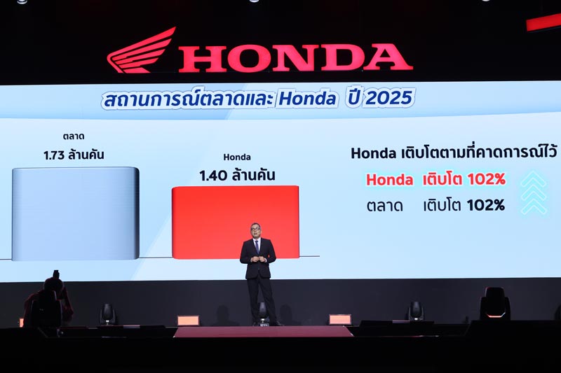 มร.ยูอิจิ ชิมิซุ ประธานกรรมการบริหาร บริษัท ไทยฮอนด้า จำกัด กล่าวว่า “ไทยฮอนด้าให้ความสำคัญกับการพัฒนาผลิตภัณฑ์ บริการ และเทคโนโลยีอย่างต่อเนื่อง เพื่อรองรับความต้องการที่หลากหลายของผู้ใช้งานในชีวิตประจำวัน ประเทศไทยถือเป็นหนึ่งในตลาดยุทธศาสตร์ที่สำคัญของฮอนด้าในภูมิภาคเอเชีย และเป็นศูนย์กลางหลักของธุรกิจรถจักรยานยนต์ในระดับภูมิภาค ในปี 2025 ที่ผ่านมา ตลาดรถจักรยานยนต์ไทยโดยรวมอยู่ที่ 1.73 ล้านคัน ไทยฮอนด้าสามารถสร้างผลงานได้อย่างแข็งแกร่ง ด้วยยอดจำหน่ายรถจักรยานยนต์กว่า 1.40 ล้านคัน เติบโต 102% เมื่อเทียบกับปีก่อนหน้า และครองตำแหน่งผู้นำตลาดรถจักรยานยนต์ในประเทศไทยอย่างต่อเนื่องเป็นปีที่ 37 ความสำเร็จดังกล่าวสะท้อนถึงความแข็งแกร่ง และการสนับสนุนอย่างใกล้ชิดจากเครือข่ายผู้จำหน่ายทั่วประเทศ”