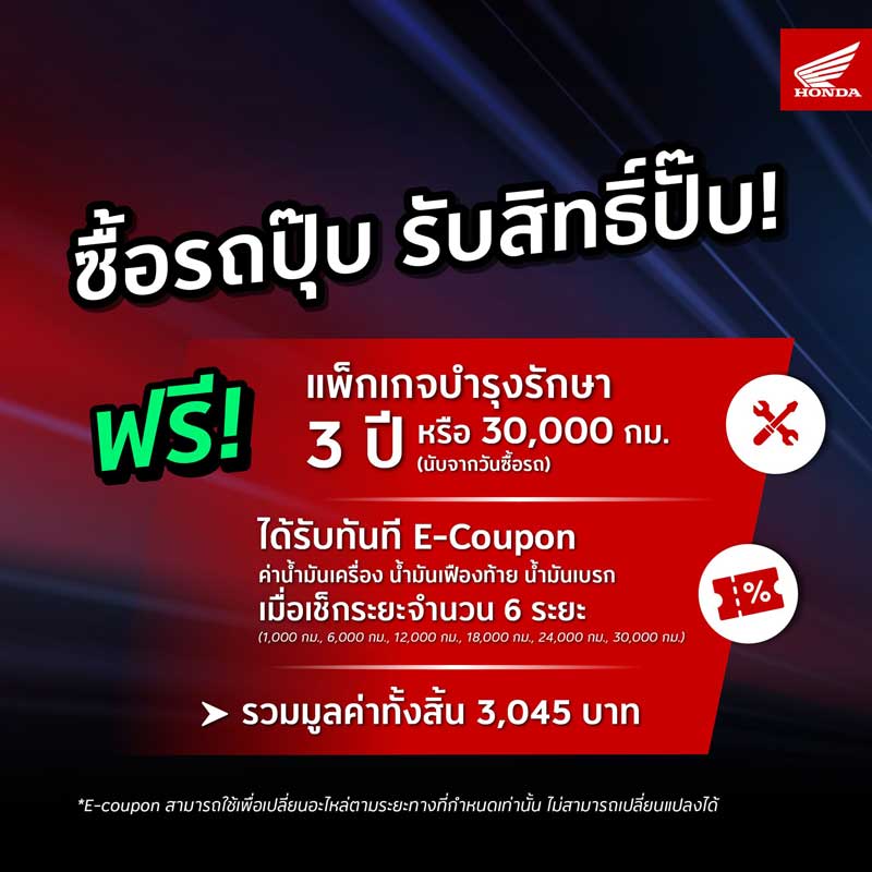 - รับ E-Coupon รวมมูลค่า 3,045 บาท สำหรับค่าน้ำมันเครื่อง น้ำมันเฟืองท้าย และ น้ำมันเบรกเมื่อเข้ารับบริ