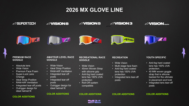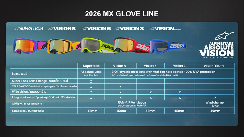 ทั้งนี้ บริษัท เพซแม็กซ์ มอเตอร์สปอร์ต จำกัด ผู้นำเข้าและตัวแทนจัดจำหน่ายอุปกรณ์ขับขี่เครื่องแต่งกาย Alpinestars สัญชาติอิตาลี ได้เปิดตัว “แว่นตาโมโตครอส” อย่างเป็นทางการครั้งแรกในประเทศไทย โดยวางจำหน่ายด้วยกัน 5 รุ่น ได้แก่