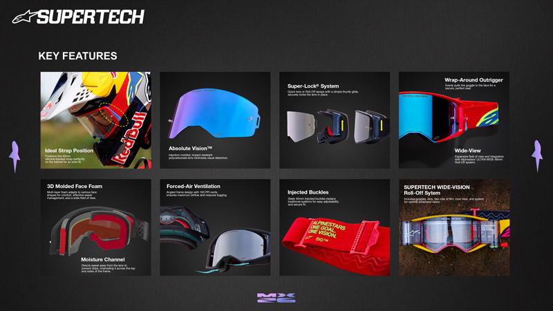 ดีไซน์พรีเมียม มุมมองที่กว้างเป็นพิเศษ พร้อมความคมชัด แว่นตาโมโตครอส รุ่น SUPERTECH โดดเด่นด้วยเลนส์ Absolute Vision™ ผลิตจากโพลีคาร์บอเนต ให้ภาพคมชัดไร้การบิดเบือน พร้อมเลนส์มุมกว้างพิเศษ ULTRA-WIDE ขนาด 48 มม. อีกทั้งยังมีระบบ Super-Lock® สำหรับถอดเปลี่ยนเลนส์หรือ Roll-Off ได้รวดเร็ว โดยไม่ต้องสัมผัสเลนส์โดยตรง