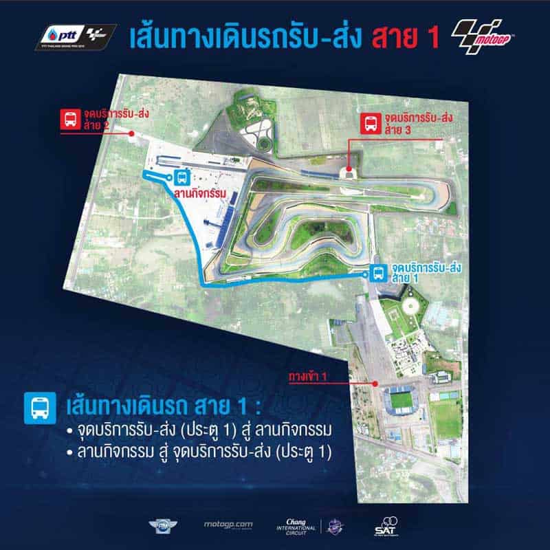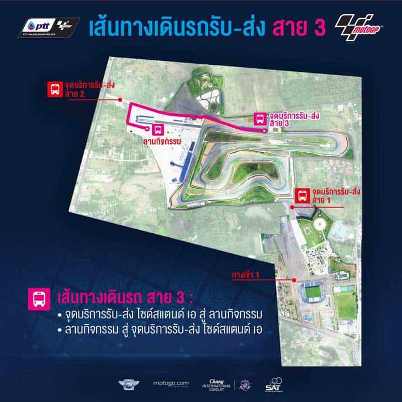 - สาย 3 รถวิ่งจากลานกิจกรรมไปยัง ไซด์สเเตนด์ โซน A เหมาะ สำหรับผู้ถือบัตร ไซด์สเเตนด์ (บัตรสีฟ้า)