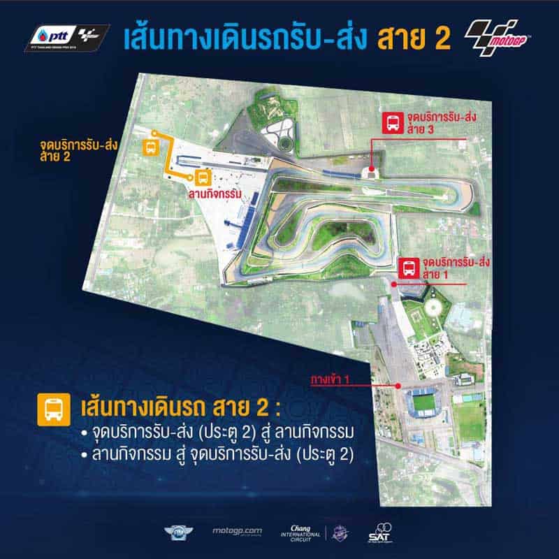 - สาย 2 สำหรับ ผู้เข้ามาจากประตู 2 หรือด้านหลังสนาม รถจะวิ่งไปยังลานกิจกรรม (สำหรับประตู 2 มีจุดจอดสำหรับรถจักรยานยนต์ 250 cc ขึ้นไปด้วย) ใครเอารถจักรยานยนต์คู่ใจไปต้องวางแผนให้ดีๆ