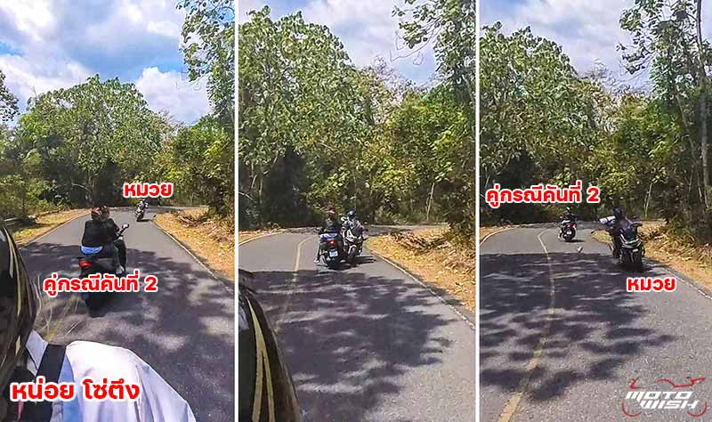 จังหวะเกิดเหตุกับ “คู่กรณี คันที่ 2” ด้วยความที่ขี่ตามกันมากับคันหน้า คันหน้าบานโค้งยังไงคันหลังก็บานตามไปในไลน์เดียวกัน จังหวะในภาพต่อเนื่องจากกล้องติดหมวกของ “หน่อย โซ่ตึง” ก่อนภาพคือ “คู่กรณี คันที่ 2” ในรูปบานโค้งเฉียดรถหน่อย แล้วบานกินข้ามไปอีกเลนซึ่งจังหวะนั้น “หมวย แฟนหน่อย” เอียงรถหลบแล้วแต่ไม่พ้น ทำให้เกิดการเฉี่ยวชนกัน โดยคนซ้อนบนรถ “คู่กรณี คันที่ 2” ขาไปกระแทกกับตัวรถ “หมวย แฟนหน่อย” จนข้อเท้าบิดรองเท้าหลุดตกอยู่กลางถนนดังภาพ