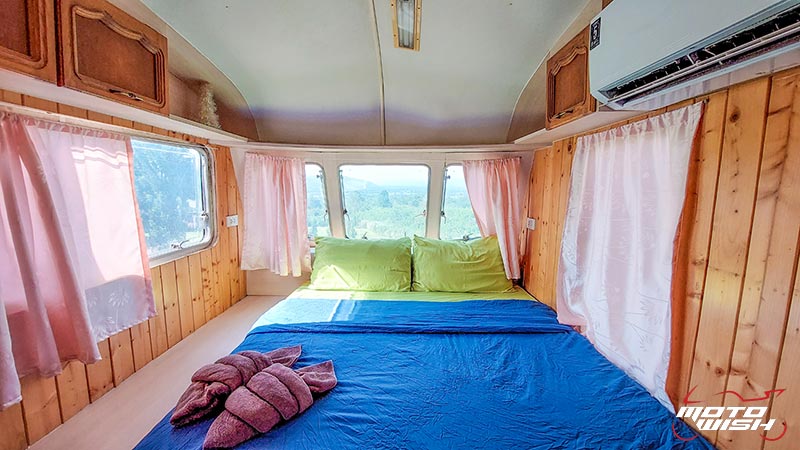 เปิดประตูเข้ามาดูที่นอนในรถบ้าน ด้านฝั่งหัวเตียงหันหน้าไปทางวิวภูเขา สามารถนอนมองธรรมชาติได้สบายตาเลยทีเดียว