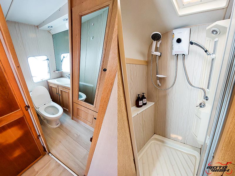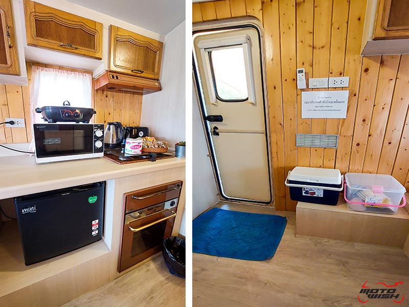 ส่วนอุปกรณ์ในรถบ้านมีให้พร้อมสรรพ เตาปิ้งย่าง ไมโครเวฟ ตู้เย็น กาต้มน้ำร้อน ไดร์เปาผม กระติกน้ำ จานชามช้อนซ้อม ห้องน้ำมีน้ำอุ่นสำหรับหน้าหนาว ที่สำคัญ ยาสระผม ครีมอาบน้ำ หอมมากๆหอมกว่าโรงแรม 5 ดาวบางที่ในเมืองซะอีก