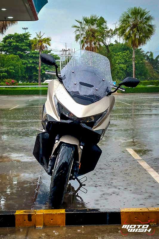 เรียกได้ว่าบิดหนีฝนกันเลย ดีที่รถ New Forza 750 ชิลด์บังลมหน้าเป็นแบบไฟฟ้า สามารถปรับความสูงได้ถึง 120 มิลลิเมตร โดยใช้สวิทช์แบบ 4 ทิศทางในการปรับ ชิลด์หน้าจะเลื่อนลงมาตำแหน่งต่ำสุดโดยอัตโนมัติเมื่อดับเครื่องยนต์ และจะเลื่อนขึ้นอัตโนมัติไปยังตำแหน่งเดิมที่ตั้งไว้เมื่อบิดสวิทช์สตาร์ทรถอีกครั้ง แล้วแอดใส่หมวกแบบวิบากมาดด้วยนะต้องก้มหัวลงนิดนึงหลบหลังชิลด์เพื่อไม่ให้ฝนเข้าตา พอชิลด์หน้าขึ้นสูงสุดช่วยได้มากๆเลย