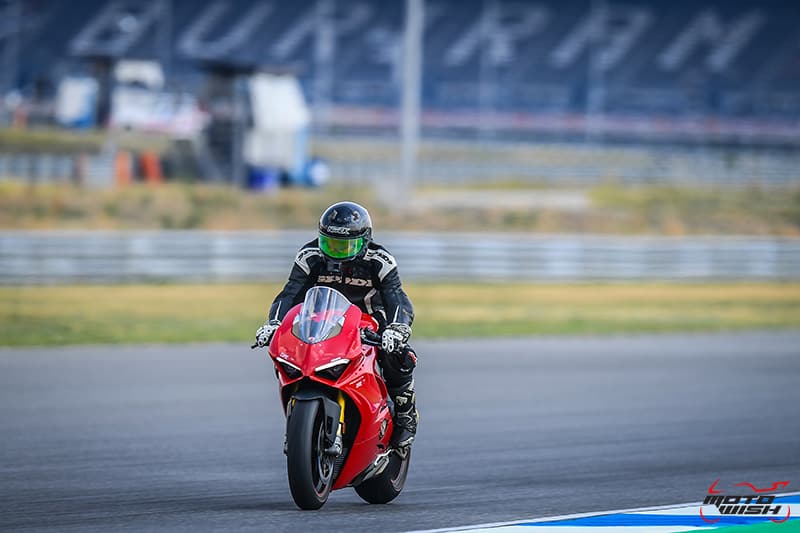 ถึงแม้เวลาในการ Setting ระบบโช้คไฟฟ้าของ Panigale V4S จะมีเวลาค่อนข้างน้อย แต่การใช้โหมดที่เหมาะสมกับการลง Track ก็ทำให้เห็นถึงประสิทธิภาพในการเข้าโค้งได้อย่างยอดเยี่ยม จากภาพจะเห็นได้ว่าการแบนโค้งเข่าไม่ได้กางมากนัก ปลายพักเท้าห่างจากพื้นแทรคไม่น่าเกิน 3 นิ้ว ยังสามารถลงได้อีกแต่เทสไรเดอร์ก็ต้องขี่แบบเพลย์เซฟด้วย