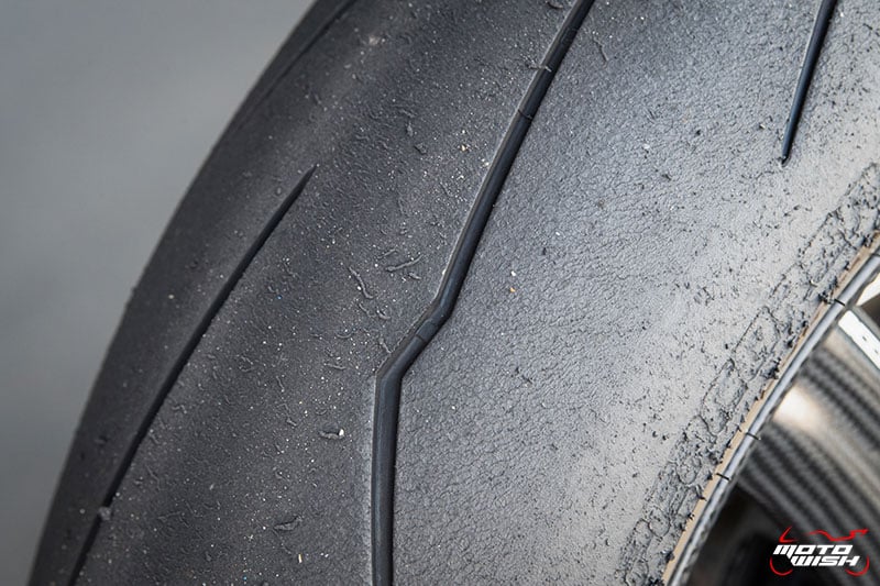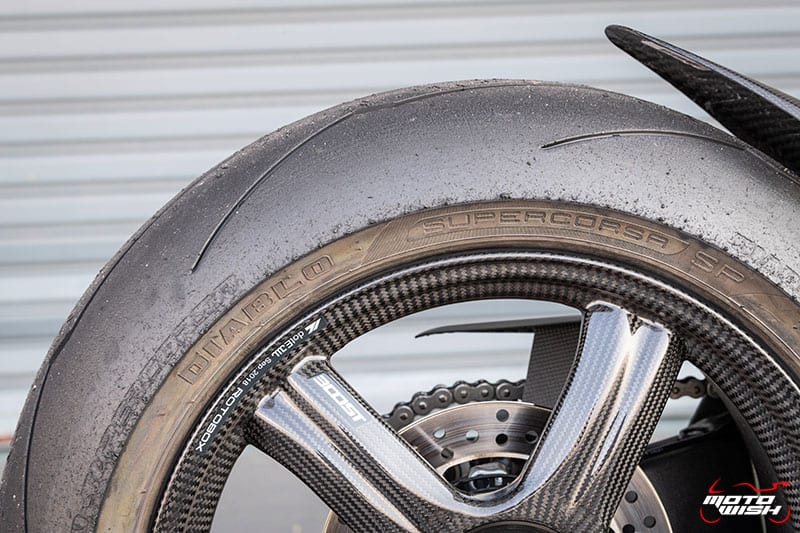 ยาง Pirelli Diablo รุ่น Supercorsa SP ถ่ายทอดเทคโนโลยีจากยางแข่งขัน WorldSBK ให้ฟิลลิ่งการเกาะผิวแทรคอยู่ในระดับที่ดีมาก เนื้อยางข้างค่อนนิ่ม การเลี้ยวโค้งไม่ว่าจะเป็นโค้งแคบความเร็วต่ำ หรือโค้งกว้างความเร็วสูงเกิน 200 กม./ชม. ถือว่าเหมาะสมกับรถ Panigale V4S เพียงแต่ต้อง Setting ลมยางให้เหมาะสมกับอุณหภูมิของผิวแทรค เพื่อให้ได้ประสิทธิภาพสูงสุด