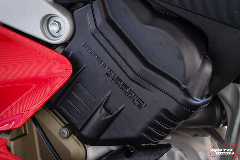 หน้าตาเครื่องยนต์ Desmosedici Stradale V4 ที่ดูคาติตั้งใจเปลี่ยนประวัติศาสตร์รถสายสปอร์ตอีกครั้ง ดูจากสเปคแล้วทรงพลังยิ่งนัก ดูคาติพยายามเป็นอย่างมากเพื่อให้เครื่องยนต์ลูกนี้มีน้ำหนักน้อยที่สุดเท่าที่จะทำได้ แต่สุดท้ายแล้วด้วยเครื่อง V4 สี่สูบยังคงมีน้ำหนักมากกว่า 2 สูบ เพียงเล็กน้อยแต่ยังคงความกระทัดรัดฟัดกับคู่แข่งได้อย่างไม่เกรงกลัว แถมเครื่องยนต์บล็อคใหม่นี้นำเทคโนโลยีสายตรงจากสนามสู่ถนนอารมณ์เหมือนขี่รถ MotoGP