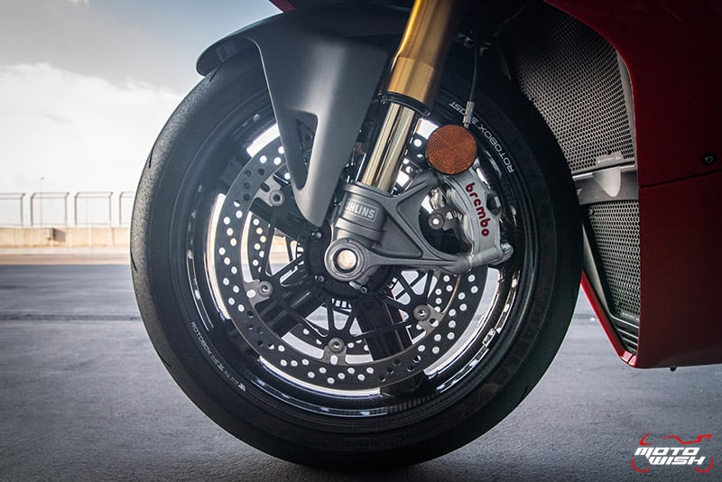 Panigale V4 โช้คหน้ายี่ห้อ Showa รุ่น BPF ขนาด 43 มิลลิเมตร ปรับตั้งค่าได้เต็มระบบ เป็นรุ่นยอดนิยมที่ใส่อยู่ในตัวพันหลายๆค่าย ส่วน Panigale V4S (ในรูป) โช้คหน้าแบบไฟฟ้ายี่ห้อ Öhlins รหัส NIX30 ขนาด 43 มิลลิเมตร ปรับตั้งค่าได้เต็มระบบเช่นกัน แต่ง่ายเพียงปลายนิ้วกดที่สวิทช์บนประกับฝั่งซ้ายมือของแฮนด์