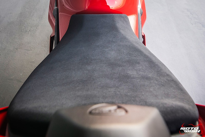 เบาะนั่งให้ความกระชับพอเหมาะไม่แข็งกระด้างจนเกินไป ผิวสัมผัสเกาะกับชุดหนังได้ดีไม่ลื่นเหมือนรถบางรุ่นที่ลื่นจนบางทีตัวจะหล่นลงจากรถเวลาพลิกรถเทโค้งเร็วๆ