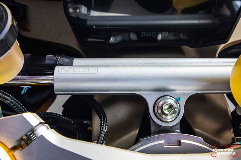 Panigale V4 โช้คหลังเลือกใช้ของ Sachs ปรับตั้งค่าได้เต็มระบบ ส่วน Panigale V4S (ในรูป) โช้คหลังแบบไฟฟ้ายี่ห้อ Öhlins รหัส TTX36 ปรับตั้งค่าได้เต็มระบบโดยกดที่สวิทช์บนประกับฝั่งซ้ายมือของแฮนด์ โช้คไฟฟ้าหน้าหลังทำงานควบคู่กับระบบ Ohlins Smart EC เวอร์ชั่น 2.0