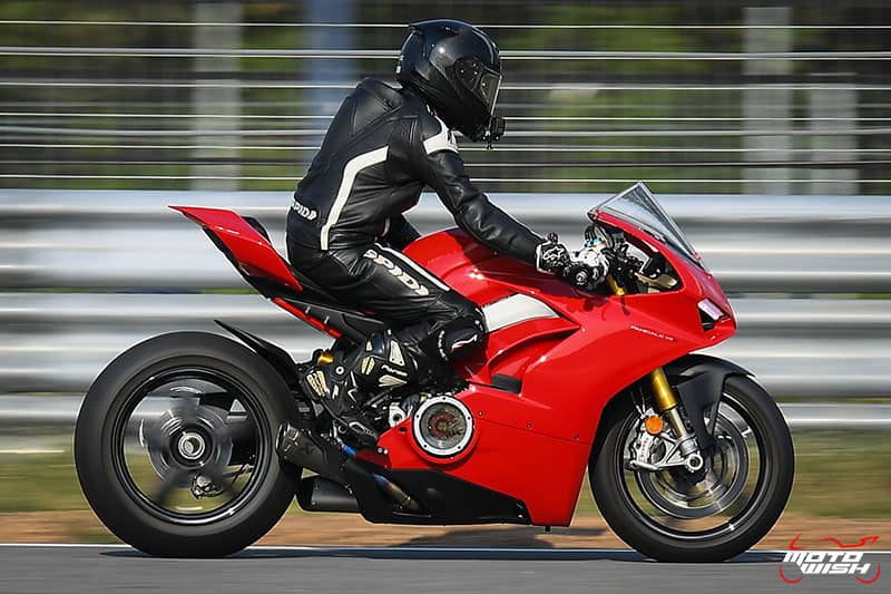 รถ Panigale V4S ระยะความสูงจากพื้นถึงเบาะนั่ง 830 มิลลิเมตร ถือว่าไม่ได้สูงมากมายนัก ชายไทยขาสั้นไม่ต้องเต้นบัลเล่ต์โชว์ เพราะเตี้ยกว่ารถ R1 ที่เบาะนั่งสูง 855 มิลลิเมตร และ R1M สูงถึง 860 มิลลิเมตร เทสไรเดอร์ความสูง 170 เซนติเมตร เหยียบพื้นได้เกือบเต็มฝ่าเท้า ช่วงแรกของการทดสอบเปิดหน้ายางวอร์มอุณหภูมิให้ได้ที่ พร้อมทำความคุ้นเคยกับคันเร่งและโพซิชั่นตัวรถก่อน จังหวะแรกที่เอียงรถเข้าโค้ง รถเลี้ยวเอนแบนเข้าโค้งได้อย่างง่ายดายรวดเร็ว จนรู้สึกเหมือนไม่ได้ขี่รถคลาสพันซีซีแบบที่เคยขี่มา อารมณ์ประมาณเหมือนขี่รถ Supersport 600 cc. (อีกแล้ว)