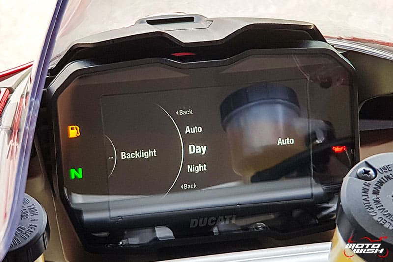 และยังเลือกปรับค่าการแสดงผลได้ 2 แบบ คือ Road / Track เพื่อให้ง่ายต่อการสังเกตตัวเลข ยังไม่หมดๆยังมีระบบ DMS – Ducati Multimedia System เรียกดูตัวเลขข้อมูลการขับขี่แบบต่างๆขึ้นหน้าจอให้ได้ศึกษาทำสถิติอีก