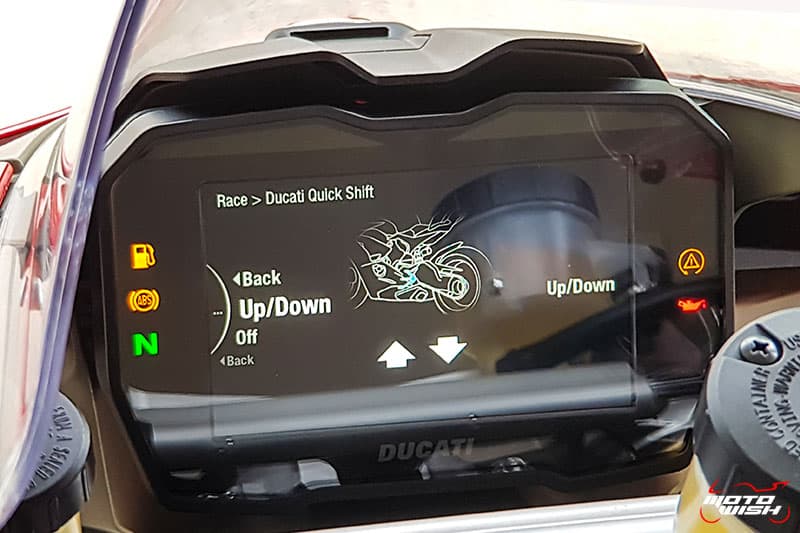 ในส่วนของหน้าจอสำหรับรถ Panigale V4 ที่ได้รับการอัพเกรดซอฟแวร์กล่อง ECU จากการใส่ท่อแต่งแบบ Full Race เวลาเปิดสวิทช์กุญแจที่หน้าจอฝั่งขวามือจะขึ้นข้อความโหมด Racing Pro