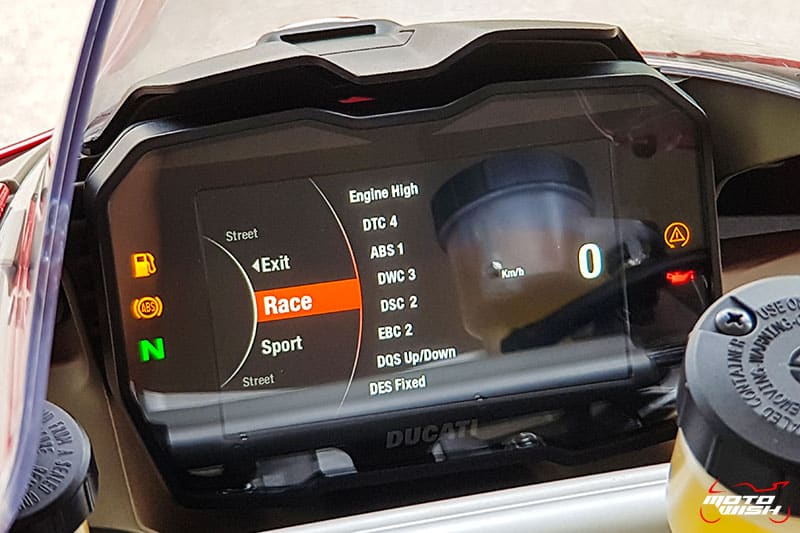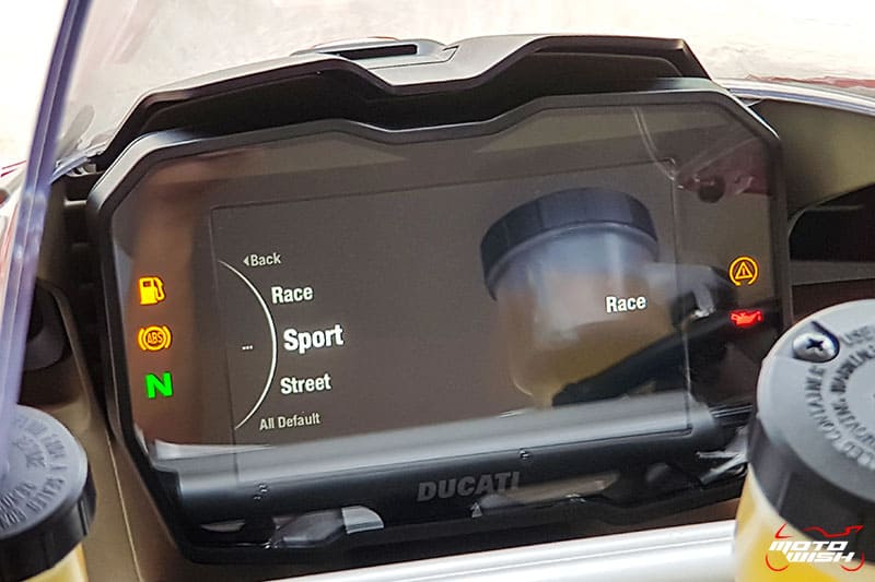 Panigale V4 สามารถเลือกปรับโหมดการขับขี่ได้ทั้งหมด 3 แบบ คือ Street , Sport , Race พอกดเลือกเข้าโหมดที่ต้องการไปแล้วข้างในจะมีระบบต่างๆให้เลือกปรับตั้งค่าได้อีกดังนี้